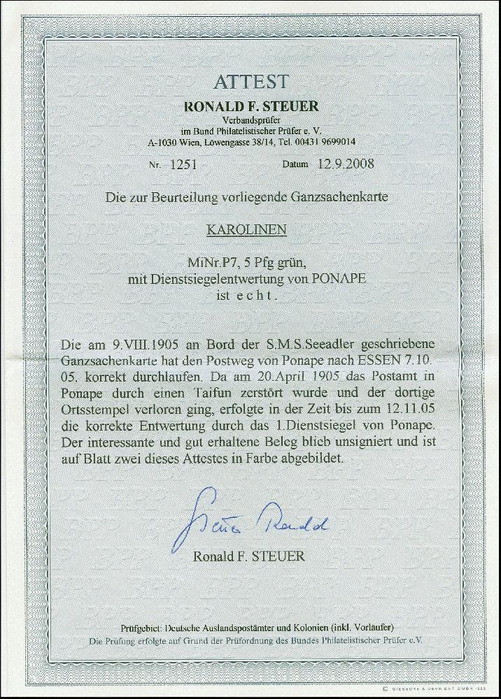 | Zusatzinformationen und Suchstichworte: | 383. Auktion Heinrich Köhler 14.–15. & 18.–23. März 2024 Los 7178 Deutsche Kolonien Karolinen "KAISERLICH DEUTSCH POSTAGENTUR PONAPE KAROLINEN" Dienstsiegel-Entwertung auf Ganzsachenkarte 5 Pfennig mit viel Text und Datierung "Ponape, Karolinen SMS Seeadler 9.VIII.1905" nach Essen mit Ankunftsstempel in einwandfreier Erhaltung, seltene Entwertung auf Bedarfspost, signiert Jäschke-L. BPP und Fotoattest R. Steuer BPP (2008) Ausruf 100,00 EUR |