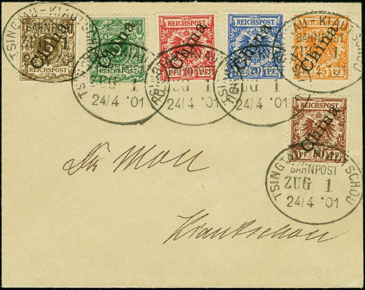 | Zusatzinformationen und Suchstichworte: | 383. Auktion Heinrich Köhler 14.–15. & 18.–23. März 2024 Los 7181 Deutsche Kolonien Kiautschou Mitläufer 1901, Krone/Adler 3-50 Pfennig mit steilem Aufdruck komplett je mit klarem Bahnpost-Stempel "TSINGTAU-KIAUTSCHOU ZUG 1 24.4.01" als Mitläufer-Ausgabe auf Briefumschlag, nachbeschriftet, in einwandfreier Erhaltung. Dekorativer Satzbrief mit auf diesen Marken nicht häufiger Entwertung, Fotoattest R. Steuer BPP (1995) Ausruf 150,00 EUR |