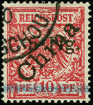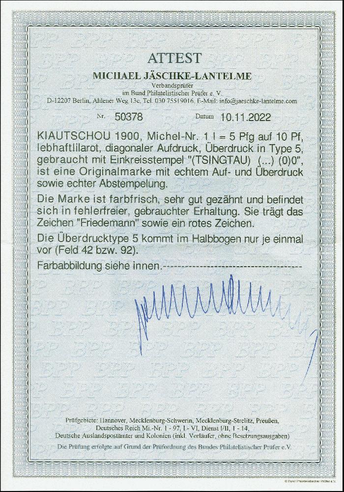 | Zusatzinformationen und Suchstichworte: | 383. Auktion Heinrich Köhler 14.–15. & 18.–23. März 2024 Los 7183 Deutsche Kolonien Kiautschou 1900, 1. Tsingtau-Ausgabe 5 Pfg. auf 10 Pfennig mit diagonalem Aufdruck, Aufdrucktype 5, sauber gestempelt, in einwandfreier Erhaltung, signiert Friedemann und Fotoattest Jäschke-L. BPP (2022) Ausruf 150,00 EUR |