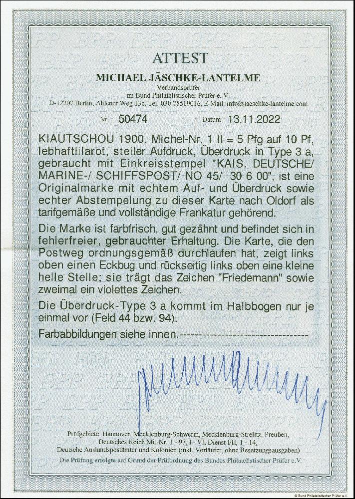 | Zusatzinformationen und Suchstichworte: | 383. Auktion Heinrich Köhler 14.–15. & 18.–23. März 2024 Los 7188 Deutsche Kolonien Kiautschou 1900, 1. Tsingtau-Ausgabe 5 Pfg. auf 10 Pfennig mit steilem Aufdruck, Aufdrucktype 3a, mit Stempel "MSP No. 45 30.6.00" (SMS Jaguar) auf Ansichtskarte mit Datierung "Südfort Taku 27.6." und Text nach Varel mit Ankunftsstempel. Die Karte mit stärkeren Beförderungsbügen im Rand und vorderseitig mit Falzresten, die Marke ist in einwandfreier Erhaltung. Eine seltene Aufdrucktype mit nicht häufiger Entwertung auf Bedarfskarte, signiert Friedemann und Fotoattest Jäschke-L. BPP (2022) Ausruf 100,00 EUR |