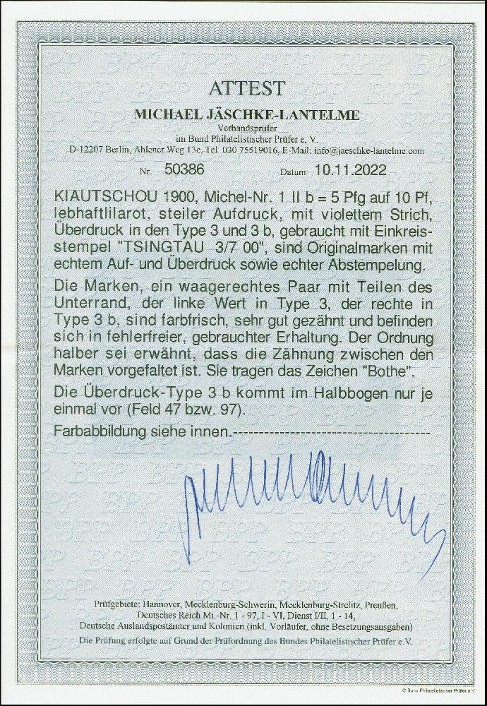 | Zusatzinformationen und Suchstichworte: | 383. Auktion Heinrich Köhler 14.–15. & 18.–23. März 2024 Los 7189 Deutsche Kolonien Kiautschou 1900, 1. Tsingtau-Ausgabe 5 Pfg. auf 10 Pfennig mit steilem Aufdruck und violettem Strich im waagerechten Paar (mit Teilen des Unterrand) mit der Aufdrucktype 3 bzw. 3b, sauber gestempelt, in einwandfreier Erhaltung, in dieser Kombination selten, signiert Bothe BPP und Fotoattest Jäschke-L. BPP (2022) Ausruf 200,00 EUR |