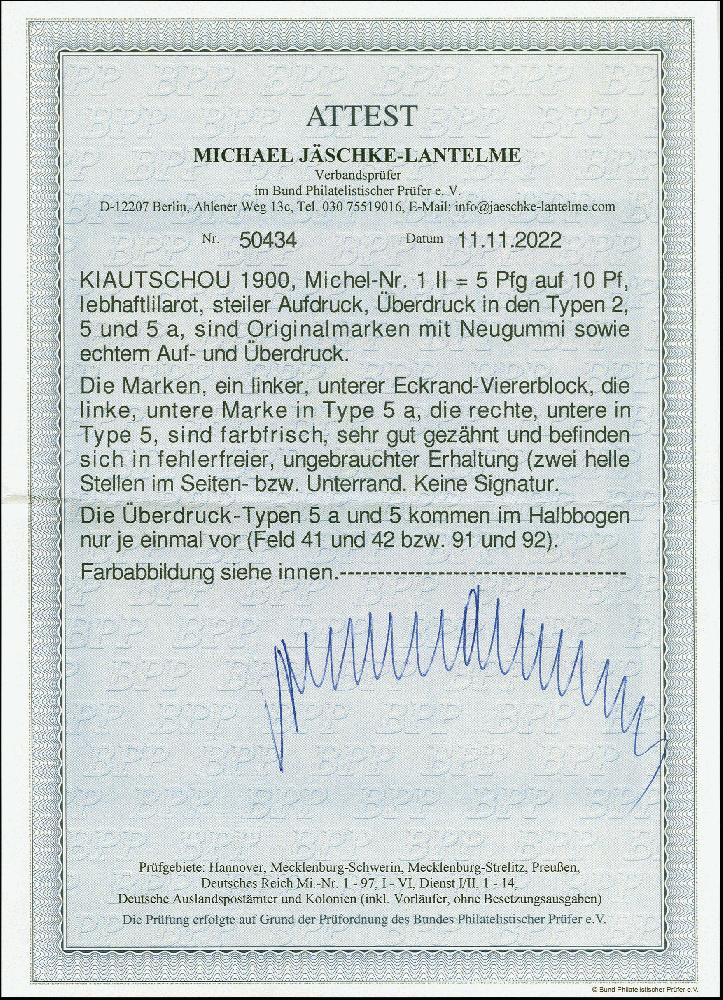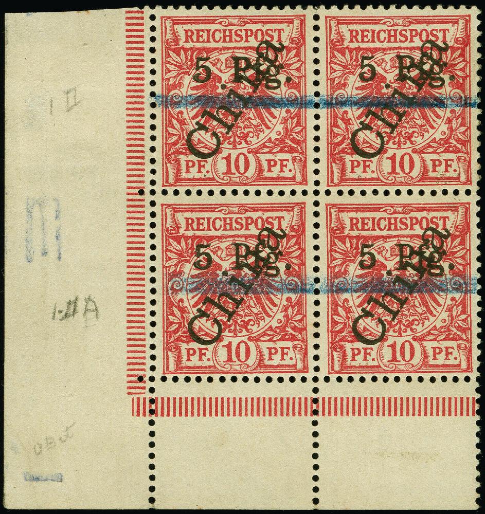 | Zusatzinformationen und Suchstichworte: | 383. Auktion Heinrich Köhler 14.–15. & 18.–23. März 2024 Los 7190 Deutsche Kolonien Kiautschou 1900, 1. Tsingtau-Ausgabe 5 Pfg. auf 10 Pfennig mit steilem Aufdruck im Viererblock aus der linken unteren Bogenecke, die beiden oberen Marken mit Aufdrucktype 2, die beiden unteren Marken mit Aufdrucktype 5 bzw. 5a, ungebraucht mit Neugummi mit hellen Stellen im Rand, Fotoattest Jäschke-L. BPP (2022) Ausruf 100,00 EUR |