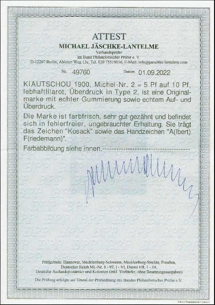 | Prüfer: | Jäschke-Lantelme, Michael (BPP (Bund Philatelistischer Prüfer)) |