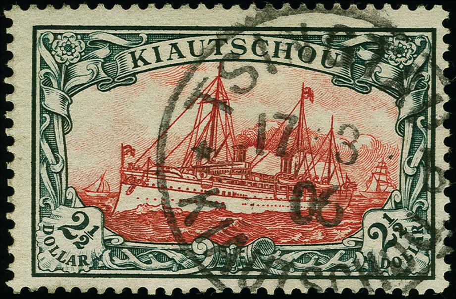 | Zusatzinformationen und Suchstichworte: | 383. Auktion Heinrich Köhler 14.–15. & 18.–23. März 2024 Los 7196 Deutsche Kolonien Kiautschou 1905, Kaiseryacht 2 ½ Dollar ohne Wasserzeichen, Zähnungslöcher 25:16, sauber mit Stempel "TSINGTAU KIAUTSCHOU *b 17.3.06" entwertet, in einwandfreier Erhaltung, sehr schönes Exemplar dieser seltenen Marke, doppelt signiert T(hier) und Fotoattest Jäschke-L. BPP (2022) Ausruf 600,00 EUR |