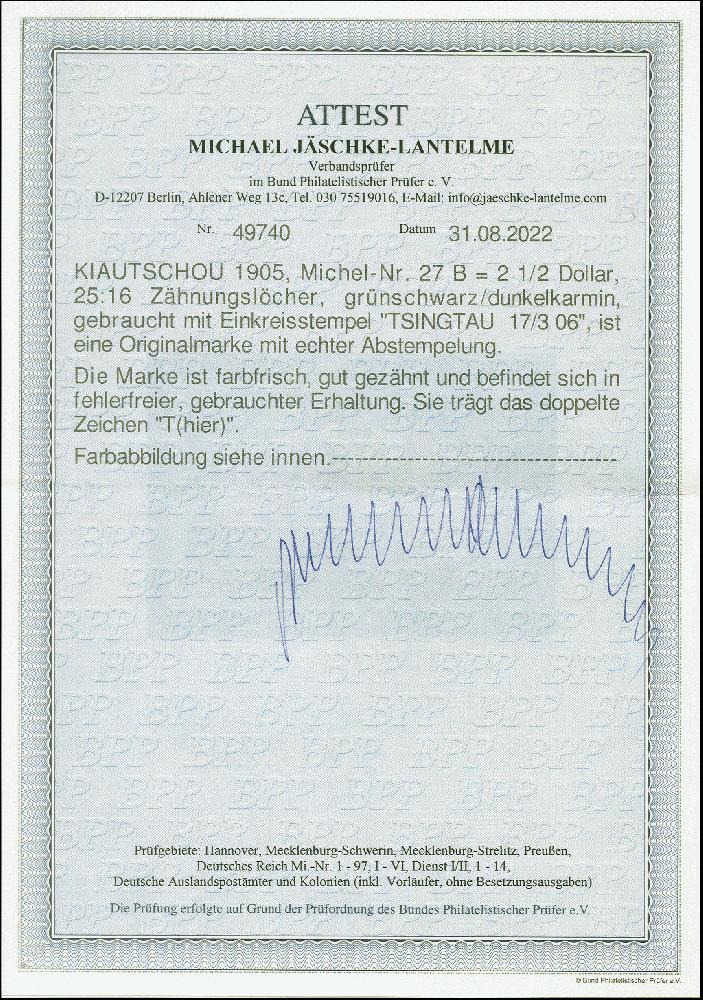 | Prüfer: | Jäschke-Lantelme, Michael (BPP (Bund Philatelistischer Prüfer)) |