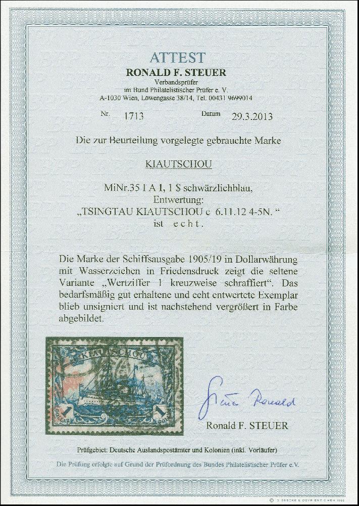 | Zusatzinformationen und Suchstichworte: | 383. Auktion Heinrich Köhler 14.–15. & 18.–23. März 2024 Los 7197 Deutsche Kolonien Kiautschou 1905, Kaiseryacht 1 ½ Dollar Friedensdruck mit Wasserzeichen, Zähnungslöcher 26:17, mit Plattenfehler "Wertziffer 1 kreuzweise schraffiert", sauber gestempelt, in einwandfreier Erhaltung, signiert R. Steuer BPP mit Fotoattest (2013) Ausruf 100,00 EUR |