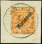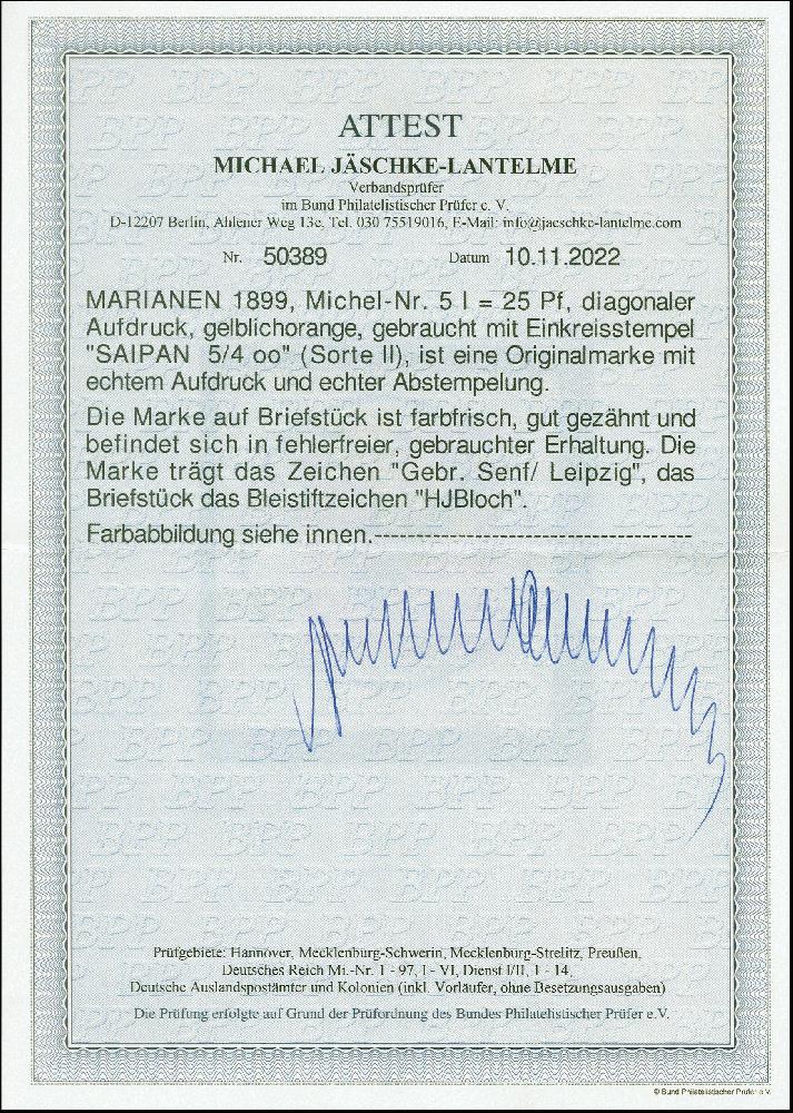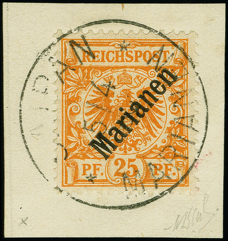 | Zusatzinformationen und Suchstichworte: | 383. Auktion Heinrich Köhler 14.–15. & 18.–23. März 2024 Los 7201 Deutsche Kolonien Marianen 1899, 25 Pfennig gelblichorange mit diagonalem Aufdruck, sauber mit Stempel "SAIPAN MARIANEN 5.4.oo" (Sorte II) auf Briefstück in einwandfreier Erhaltung, signiert Gebr. Senf und HJBloch sowie Fotoattest Jäschke-L. BPP (2022) Ausruf 200,00 EUR |