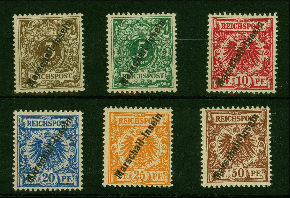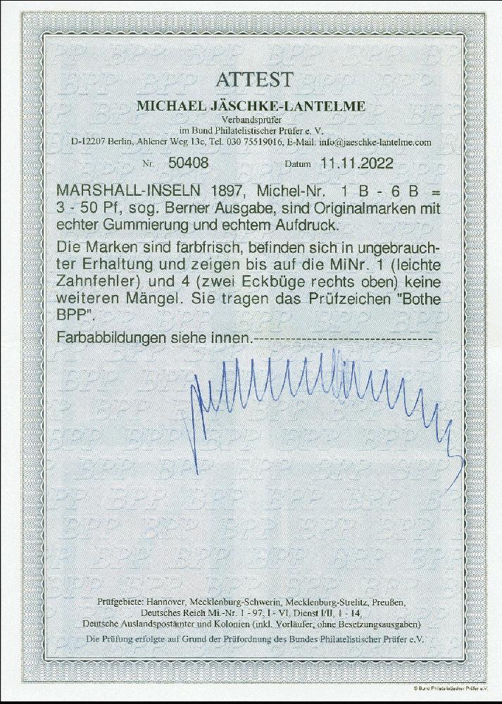 | Zusatzinformationen und Suchstichworte: | 383. Auktion Heinrich Köhler 14.–15. & 18.–23. März 2024 Los 7208 Deutsche Kolonien Marshall Inseln Ausgabe für den Weltpostverein: 1897, 3-50 Pfennig mit besonders kräftigem Aufdruck komplett, ungebraucht, 3 Pfennig mit leichten Zahnfehlern und 20 Pfennig mit Eckbügen, sonst in einwandfeier Erhaltung, signiert Bothe BPP mit Fotoattest (1979) und Fotoattest Jäschke-L. BPP (2022) Ausruf 300,00 EUR |