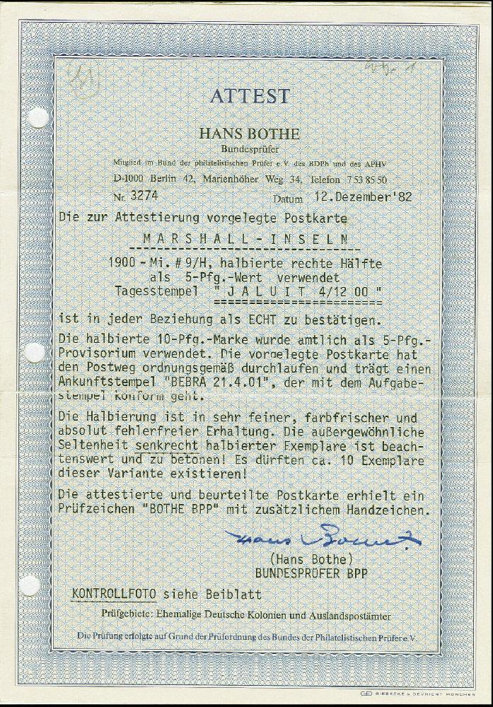 | Zusatzinformationen und Suchstichworte: | 383. Auktion Heinrich Köhler 14.–15. & 18.–23. März 2024 Los 7215 Deutsche Kolonien Marshall Inseln 1900, 10 Pfennig senkrecht halbiert (rechte Hälfte) mit Stempel "JALUIT MARSHALL-INSELN 4.12.00" auf Ansichtskarte nach Bebra mit Ankunftsstempel in einwandfreier Erhaltung; ein schönes Exemplar des "JALUIT-PROVISORIUMS" , signiert Bothe BPP mit Fotoattest (1982) und Fotoattest R. Steuer BPP (199) Ausruf 1.500,00 EUR |