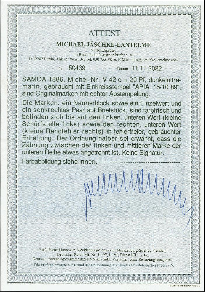 | Prüfer: | Jäschke-Lantelme, Michael (BPP (Bund Philatelistischer Prüfer)) |