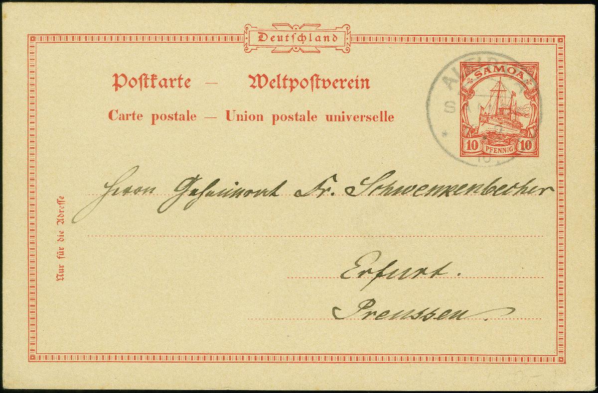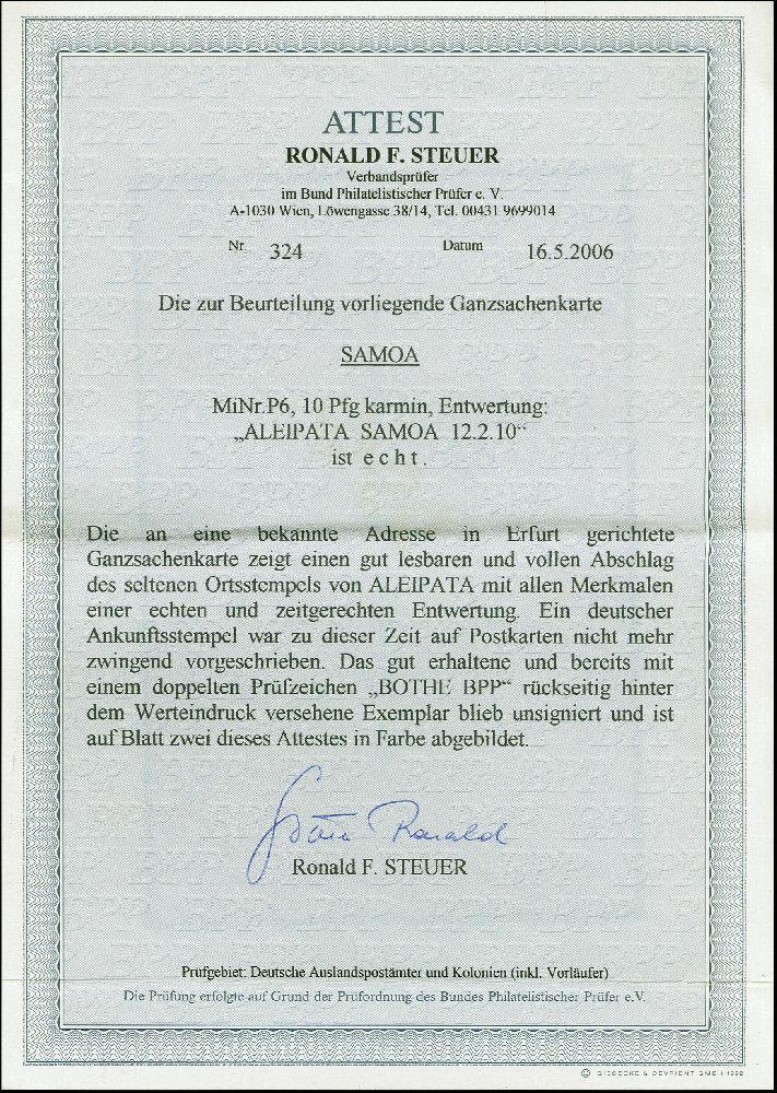 | Zusatzinformationen und Suchstichworte: | 383. Auktion Heinrich Köhler 14.–15. & 18.–23. März 2024 Los 7222 Deutsche Kolonien Samoa "ALEIPATA SAMOA 12.2.10" klar auf Ganzsachenkarte Kaiseryacht 10 Pfennig ohne Text, adressiert nach Erfurt in einwandfreier Erhaltung, doppelt signiert Bothe BPP als Briefstück und Fotoattest R. Steuer BPP (2006) Ausruf 80,00 EUR |
