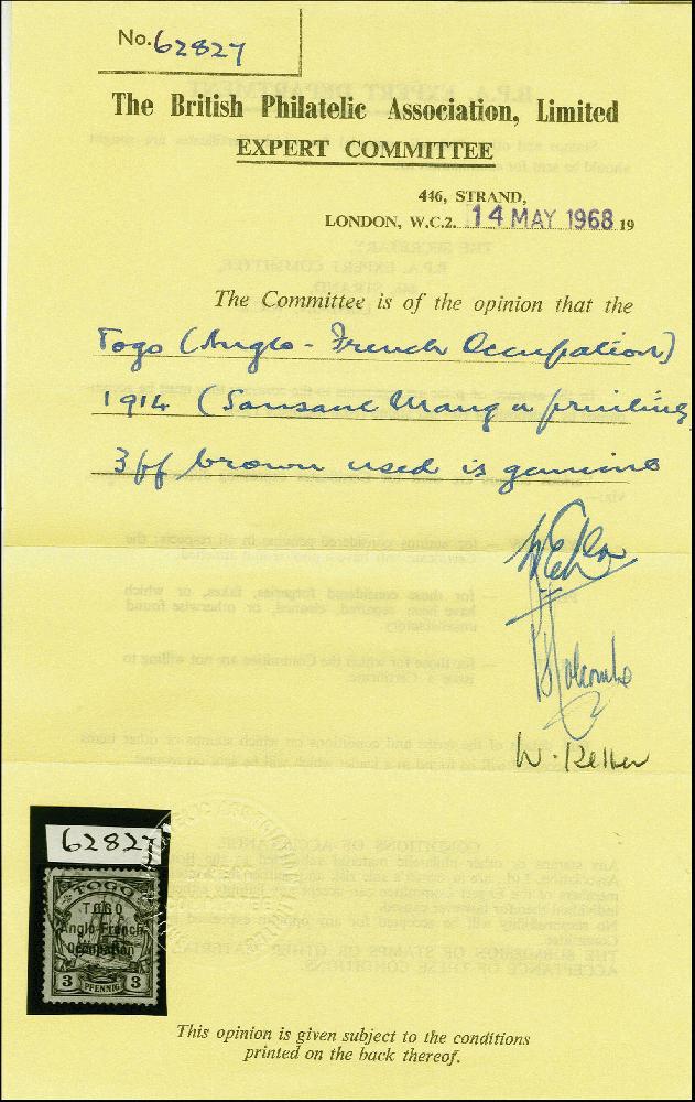 | Prüfgebiet: | Deutsche Kolonien Togo Britische Besetzung |