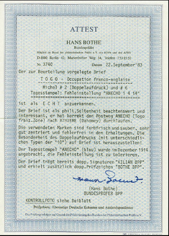 | Prüfgebiet: | Deutsche Kolonien Togo Französische Besetzung |
