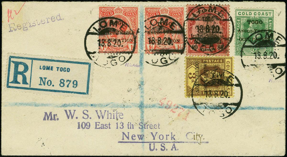 | Zusatzinformationen und Suchstichworte: | 383. Auktion Heinrich Köhler 14.–15. & 18.–23. März 2024 Los 7504 Deutsche Kolonien Togo Französische Besetzung 1915,80 pfg. Kombiniert mit Goldküste überdruckt ½d, 1 d. (2) und 3 d. alle entwertet durch Kreisdatumsstempel. "LOME 18,8,20" auf Einschreibebrief nach New York, mit mehreren rückseitige Stempel inklusive Lome, Accra, Liverpool und New York, kleinere Alterung, ansonsten feiner und seltener Brief, signiert Richter und Attest RPSL (1978) Ausruf 150,00 EUR |