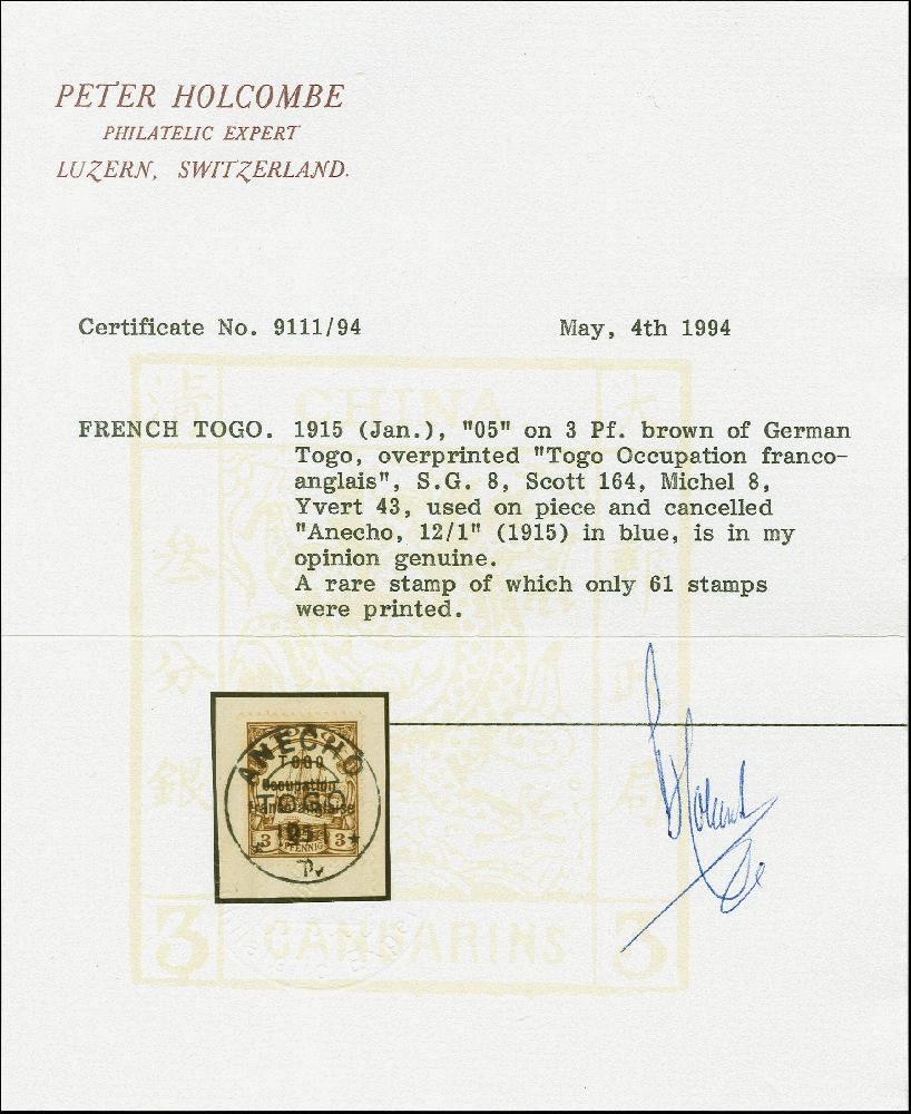 | Prüfgebiet: | Deutsche Kolonien Togo Französische Besetzung |
