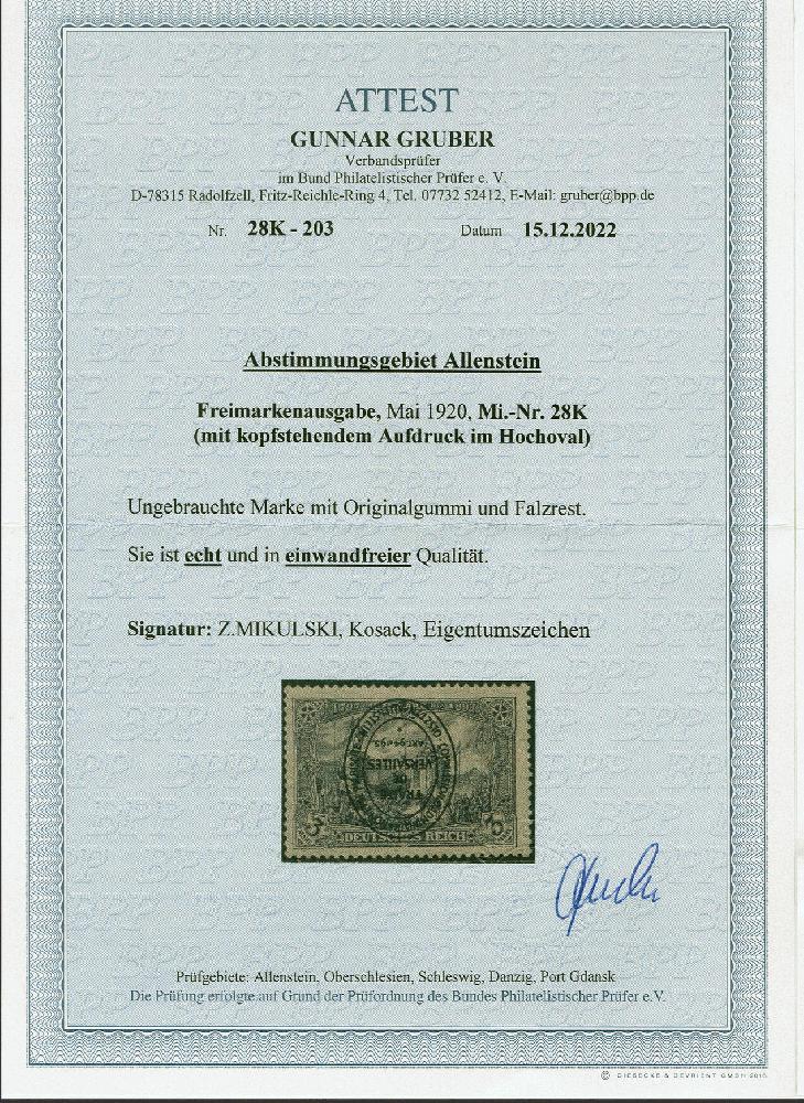 | Zusatzinformationen und Suchstichworte: | 383. Auktion Heinrich Köhler 14.–15. & 18.–23. März 2024 Los 7535 Allenstein 1920, 3 Mark mit kopfstehendem Aufdruck, ungebraucht, in einwandfreier Erhaltung. Ausruf 200,00 EUR |