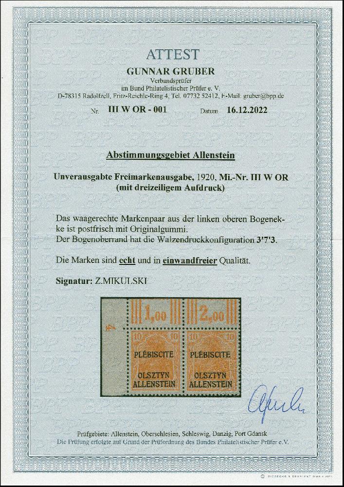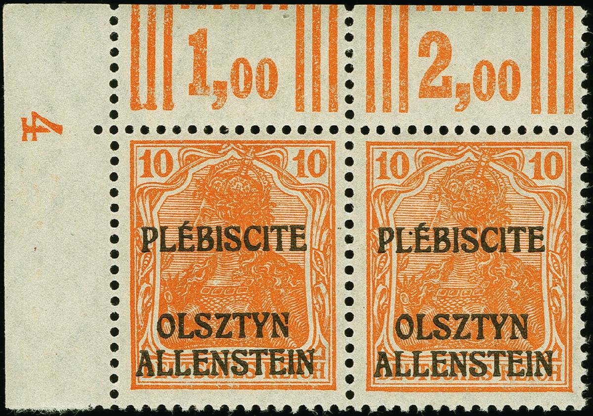| Zusatzinformationen und Suchstichworte: | 383. Auktion Heinrich Köhler 14.–15. & 18.–23. März 2024 Los 7540 Allenstein Germania 10 Pfennig im waagerechten Paar aus der linken oberen Bogenecke mit Walzendruck-Oberrand mit der Konfiguration "3'7'3, postfrisch, in einwandfreier Erhaltung Ausruf 100,00 EUR |