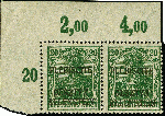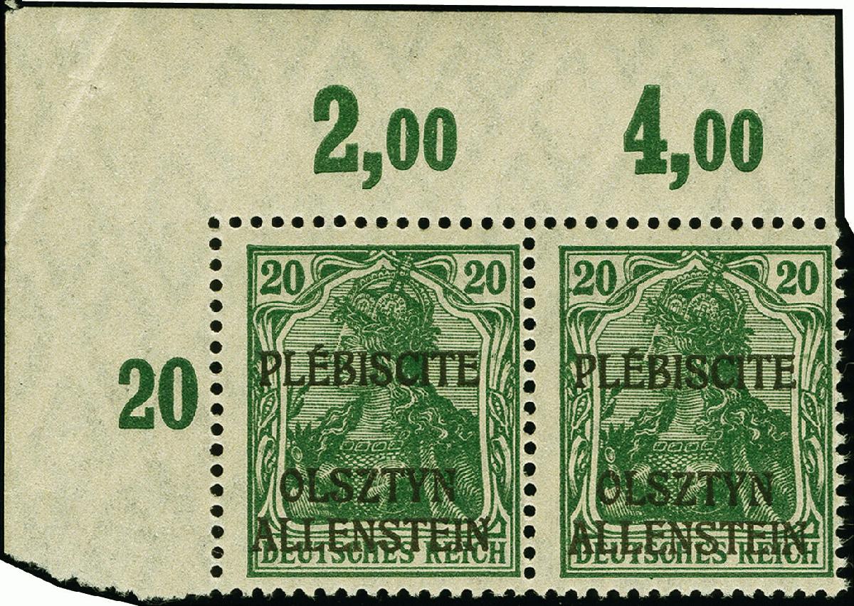 | Zusatzinformationen und Suchstichworte: | 383. Auktion Heinrich Köhler 14.–15. & 18.–23. März 2024 Los 7541 Allenstein Germania 20 Pfennig im waagerechten Paar aus der linken oberen Bogenecke mit Plattendruck-Oberrand, postfrisch, im linken Rand oben mit Eckbug, die beiden Oberrandstücke sind in einwandfreier Erhaltung Ausruf 100,00 EUR |