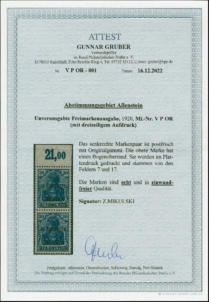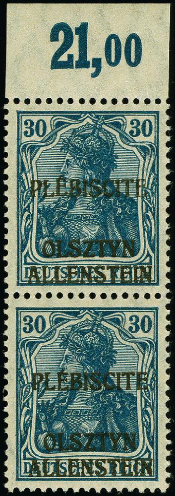 | Zusatzinformationen und Suchstichworte: | 383. Auktion Heinrich Köhler 14.–15. & 18.–23. März 2024 Los 7542 Allenstein Germania 30 Pfennig im senkrechten Paar mit Plattendruck-Oberrand, postfrisch, in einwandfreier Erhaltung Ausruf 100,00 EUR |