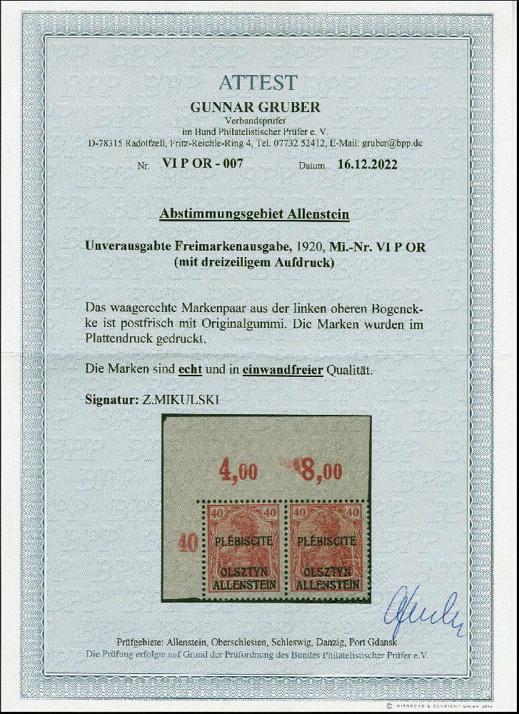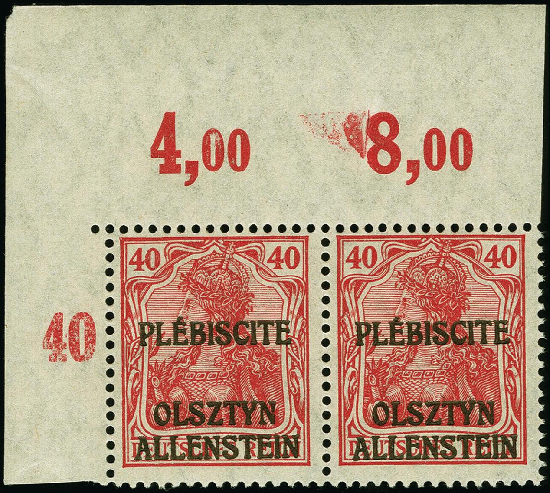 | Zusatzinformationen und Suchstichworte: | 383. Auktion Heinrich Köhler 14.–15. & 18.–23. März 2024 Los 7543 Allenstein Germania 40 Pfennig im waagerechten Paar aus der linken oberen Bogenecke mit Plattendruck-Oberrand, postfrisch, in einwandfreier Erhaltung Ausruf 100,00 EUR |