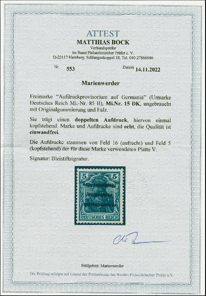 | Zusatzinformationen und Suchstichworte: | 383. Auktion Heinrich Köhler 14.–15. & 18.–23. März 2024 Los 7544 Marienwerder 1920, Germania 5 Pfennig mit doppeltem Aufdruck, davon einer kopfstehend, ungebraucht, in tadelloser Erhaltung, recht seltene Aufdruckabart Ausruf 100,00 EUR |