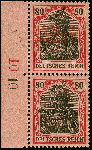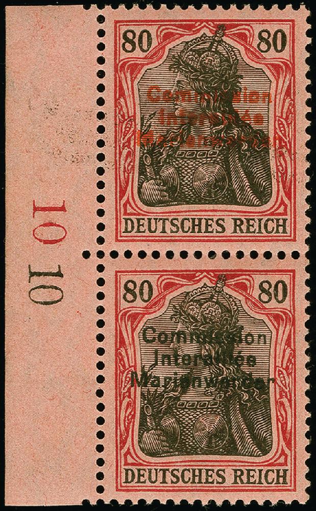 | Zusatzinformationen und Suchstichworte: | 383. Auktion Heinrich Köhler 14.–15. & 18.–23. März 2024 Los 7546 Marienwerder 1920, Germania 80 Pfennig Probedruck im senkrechten Randpaar mit rotem bzw. schwarzem Aufdruck mit engem Zeilenabstandt, postfrisch, leicht vorgefaltet, die Marken in tadelloser Erhaltung. Ein außergewöhnlich seltenes Probedruck-Paar Ausruf 800,00 EUR |