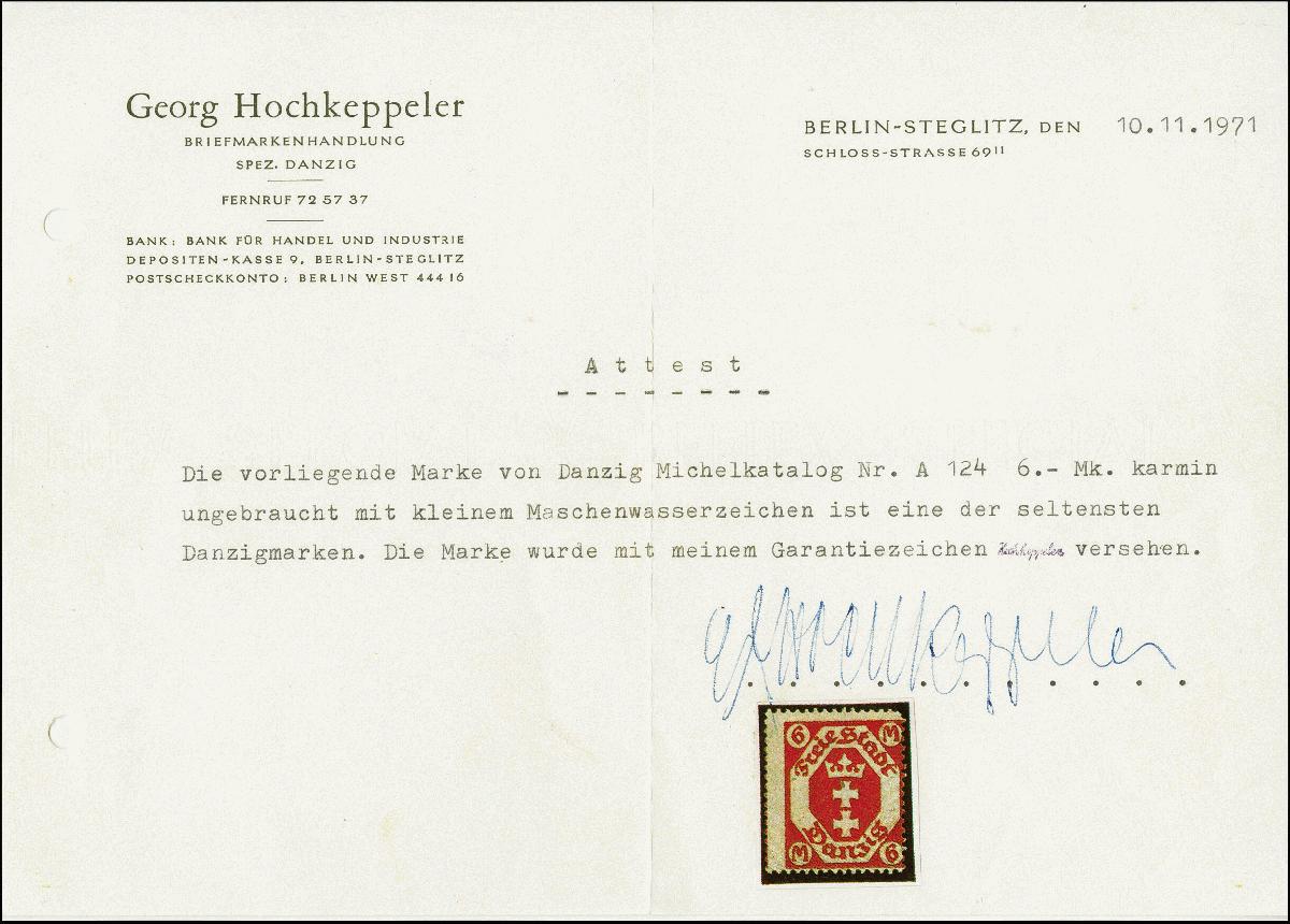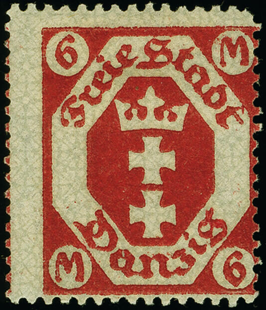 | Zusatzinformationen und Suchstichworte: | 383. Auktion Heinrich Köhler 14.–15. & 18.–23. März 2024 Los 2905 Danzig 1922, Wappenausgabe mit Wasserzeichen 'kleine Maschen': 6 Mark rotkarmin, farbfrisch und üblich dezentriert, sauber ungebraucht, oben rechts ein Zahn gering verkürzt, sonst tadellos, eine sehr seltene Marke Ausruf 500,00 EUR |