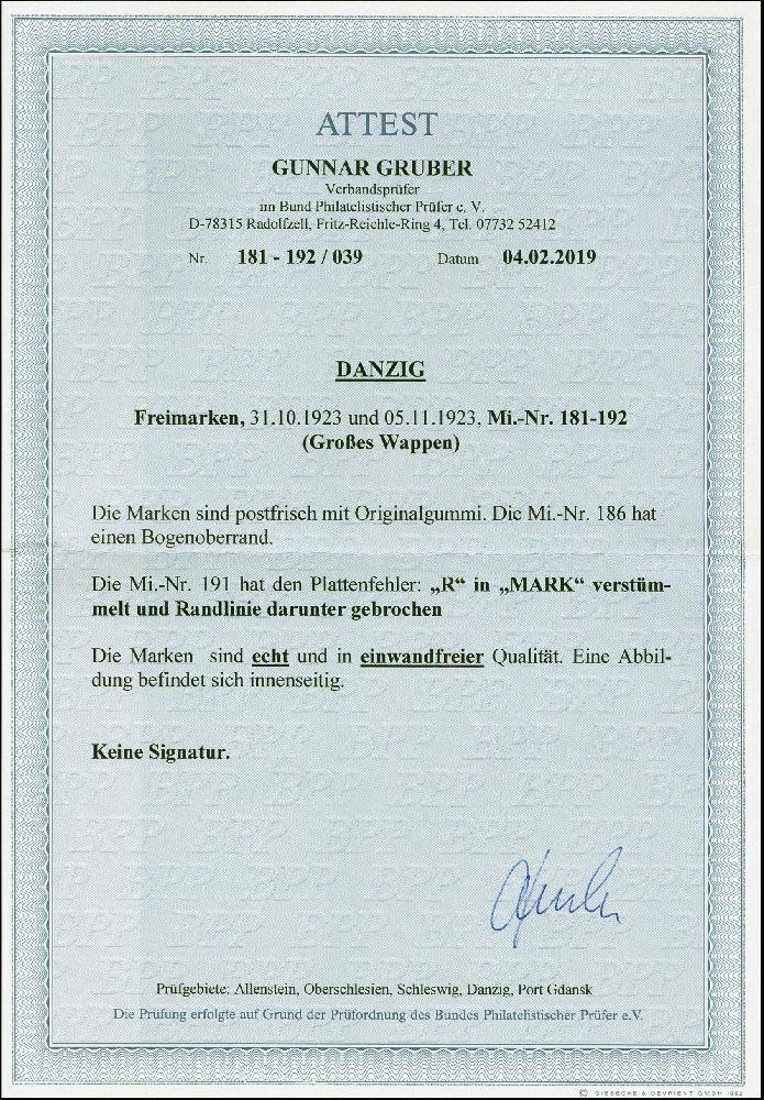 | Zusatzinformationen und Suchstichworte: | 383. Auktion Heinrich Köhler 14.–15. & 18.–23. März 2024 Los 2907 Danzig 1923, Guldenprovisorien 5 Pfg.-5 G., 3 G. mit Plattenfehler "R in MARK verstümmelt und Randlinie darunter gebrochen", postfrisch, tadellos Ausruf 80,00 EUR |