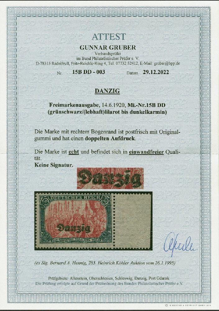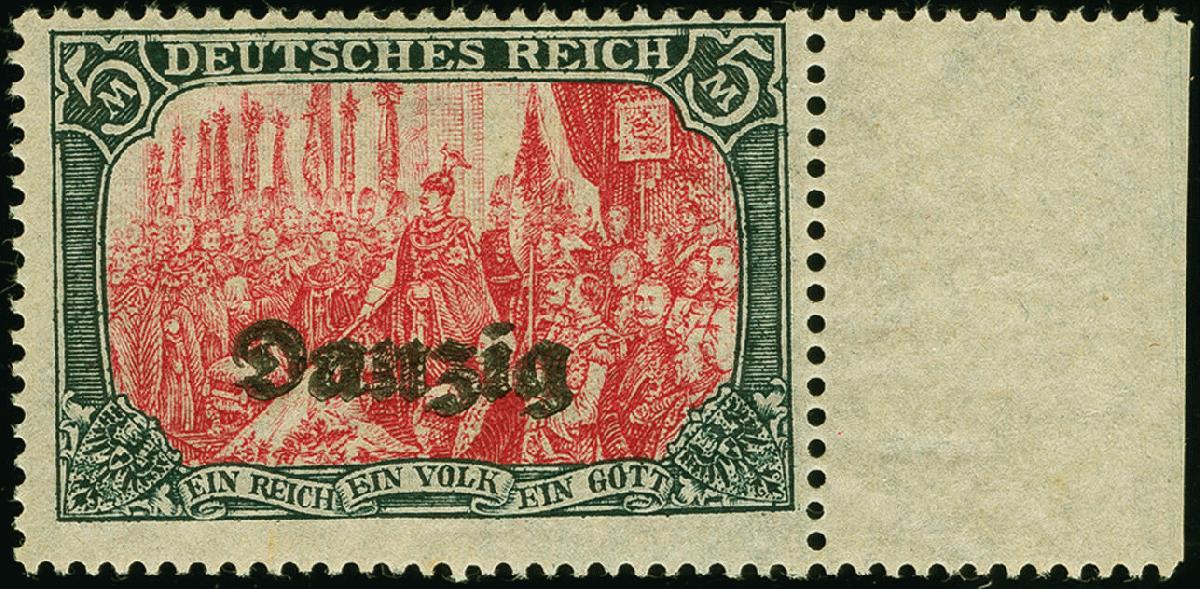 | Zusatzinformationen und Suchstichworte: | 383. Auktion Heinrich Köhler 14.–15. & 18.–23. März 2024 Los 7570 Danzig 1920, 5 Mark, Zähnungslöcher 25:17, mit doppeltem Aufdruck, Randstück, postfrisch und in tadelloser Erhaltung, altbekanntes Exemplar und sicherlich einer der schönsten Marken mit dieser seltenen Abart Ausruf 500,00 EUR |