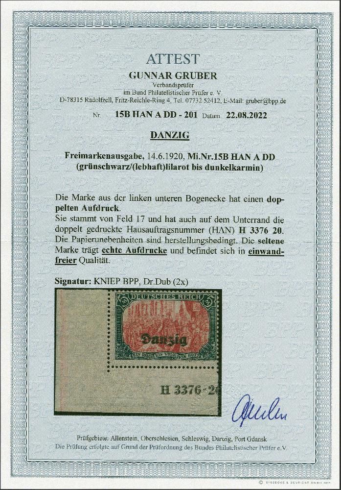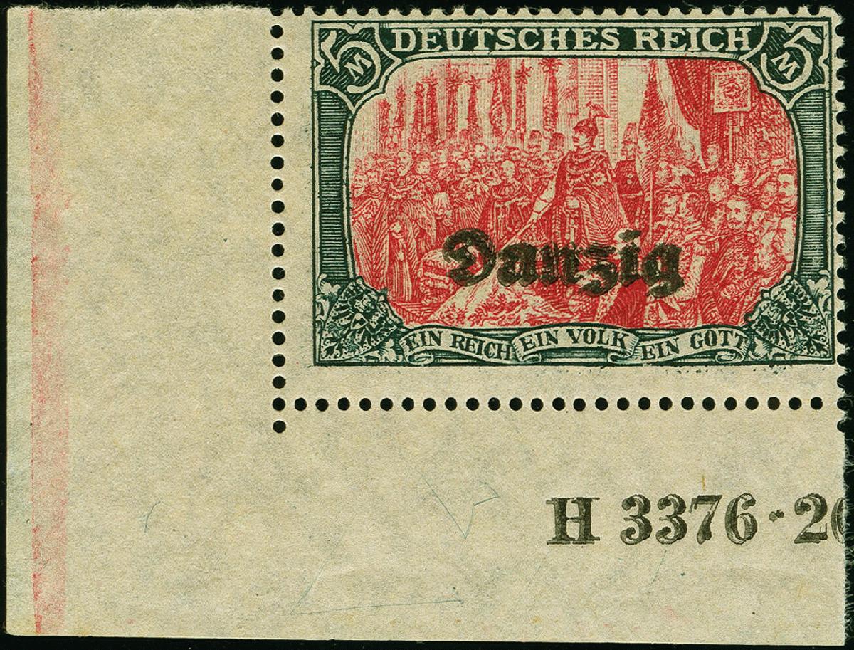 | Zusatzinformationen und Suchstichworte: | 383. Auktion Heinrich Köhler 14.–15. & 18.–23. März 2024 Los 7572 Danzig 1920, 5 Mark, Zähnungslöcher 25:17, mit doppeltem Aufdruck "Danzig" aus der linken unteren Bogenecke mit praktisch kompletter HAN "H 3376.20", ungebraucht, in einwandfreier Erhaltung, bisher haben wir nur zwei Bogenecken in dieser Art registriert Ausruf 500,00 EUR |