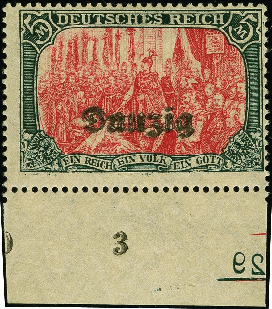 | Zusatzinformationen und Suchstichworte: | 383. Auktion Heinrich Köhler 14.–15. & 18.–23. März 2024 Los 7573 Danzig 1920, 5 Mark, Zähnungslöcher 25:17, mit doppeltem Aufdruck, Unterrand-Stück mit grüner Kontrollnummer "29" (spiegelverkehrt) und Formnummer "3", ungebraucht, in tadelloser Erhaltung Ausruf 200,00 EUR |