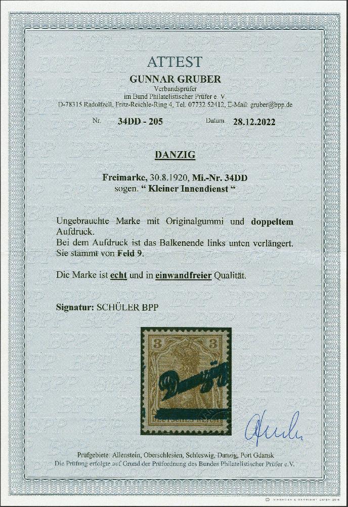 | Zusatzinformationen und Suchstichworte: | 383. Auktion Heinrich Köhler 14.–15. & 18.–23. März 2024 Los 7586 Danzig 1920, Kleiner Innendienst 3 Pfennig mit doppeltem Aufdruck (Feld 9 mit Feldmerkmahl "Balkenende links unten verlängert"), ungebraucht, in tadelloser Erhaltung Ausruf 100,00 EUR |