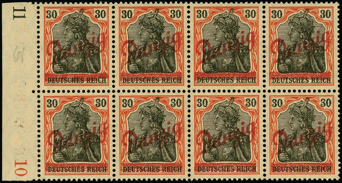 | Zusatzinformationen und Suchstichworte: | 383. Auktion Heinrich Köhler 14.–15. & 18.–23. März 2024 Los 7588 Danzig 30 Pfennig mit Aufdruckfehler "Aufdruckbalken rechts unten ausgebrochen, rechts oben abgeschrägt (Platte III, Feld 6) im waagerechten Rand-8er-Block mit sieben Normalmarken, postfrisch, in einwandfreier Erhaltung Ausruf 250,00 EUR |