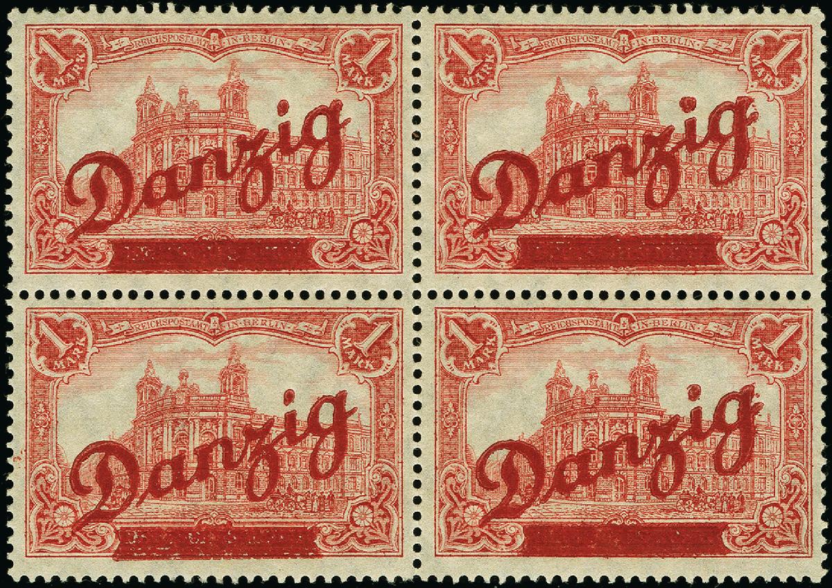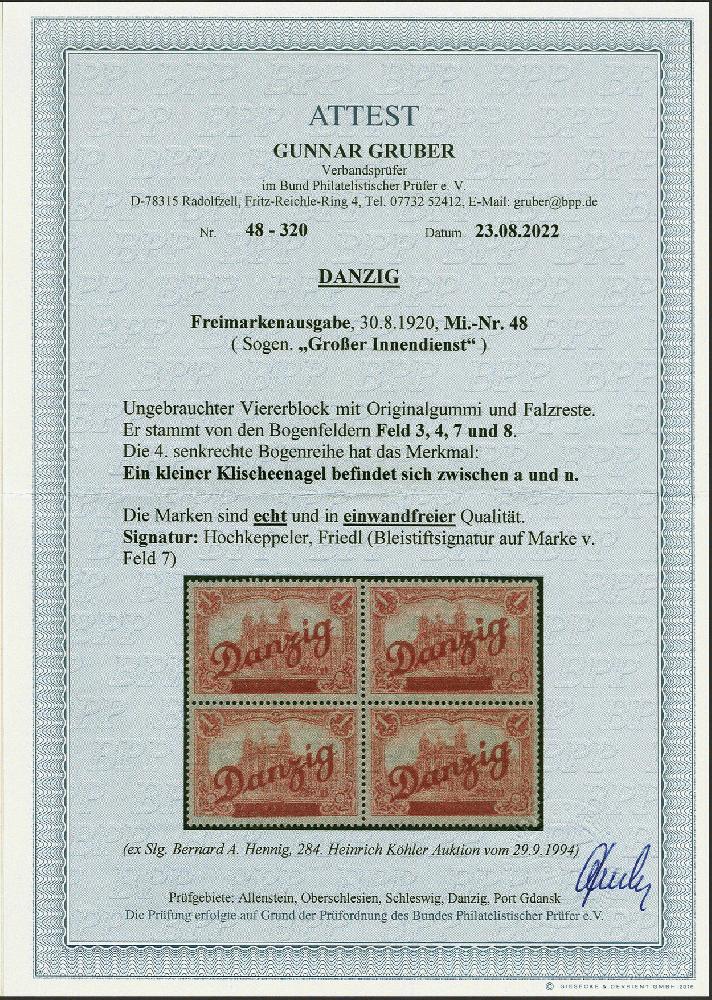 | Zusatzinformationen und Suchstichworte: | 383. Auktion Heinrich Köhler 14.–15. & 18.–23. März 2024 Los 7599 Danzig 1 Mark im leicht vorgefaltetem Viererblock (Feld 3+4/7+8), die beiden rechten Marken mit Aufdruck-Merkmal "kleiner Klischeenagel zwischen a und n" (4. senkrechte Bogenreihe), sauber ungebraucht, in einwandfreier Erhaltung Ausruf 1.000,00 EUR |
