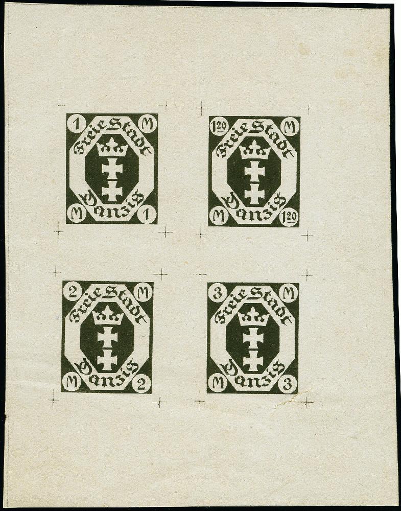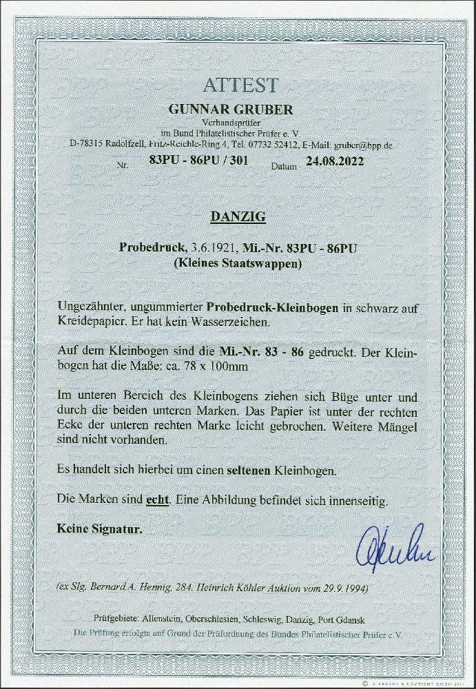 | Zusatzinformationen und Suchstichworte: | 383. Auktion Heinrich Köhler 14.–15. & 18.–23. März 2024 Los 7612 Danzig 1921, Staatswappen 1 Mark, 1,20 Mark, 2 Mark und 3 Mark Probedruck schwarz auf Kreidpapier ohne Wasserzeichen im Kleinbogen-Format, ungebraucht ohne Gummierung, im unteren Bereich des Kleinbogens sind mehrere Büge, auch durch die beiden unteren Marken gehend und unterhalb der rechten unteren Marke ist das Papier leicht gebrochen, sonst in optisch ansprechender Erhaltung, ein sehr seltener Probedruck-Kleinbogen Ausruf 200,00 EUR |