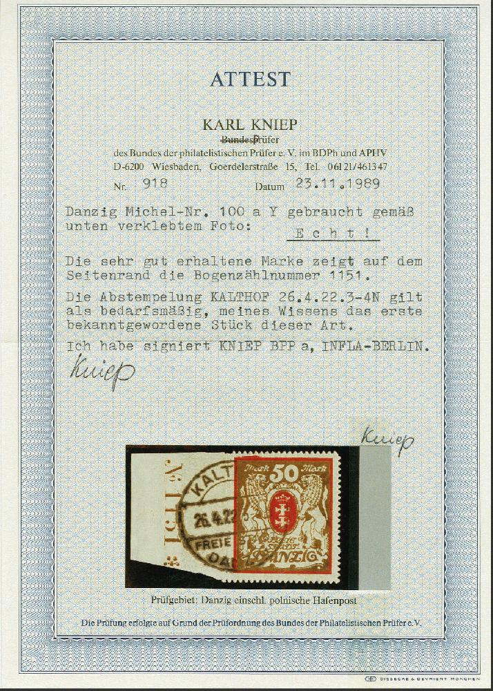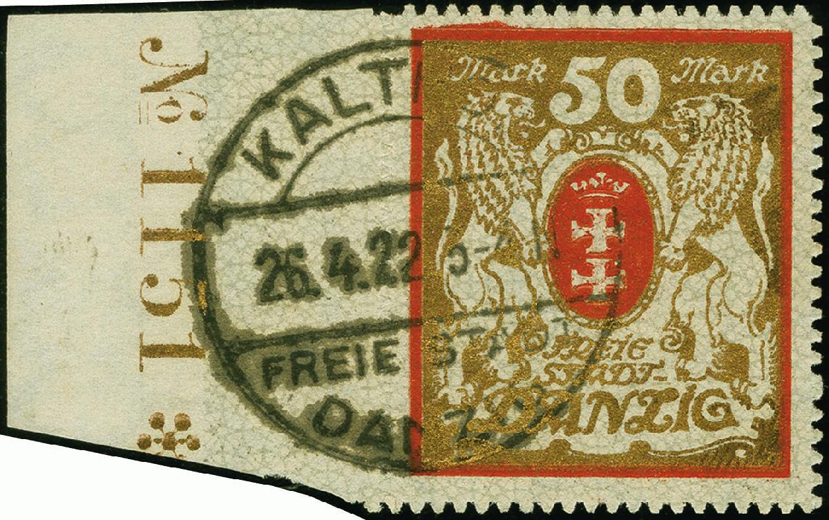 | Zusatzinformationen und Suchstichworte: | 383. Auktion Heinrich Köhler 14.–15. & 18.–23. März 2024 Los 7616 Danzig 1922, Großes Staatswappen 50 Mark rot/gold mit Wasserzeichen 2Y, Randstück mit kompletter Zählnummer "No.1151*", sauber mit zeitgerecht verwendetem Stempel "KALTHOF (FSD) 26.4.22" in einwandfreier Erhaltung, selten, bisher nur wenige Exemplare mit zeitgerechter Entwertung bekannt Ausruf 150,00 EUR |