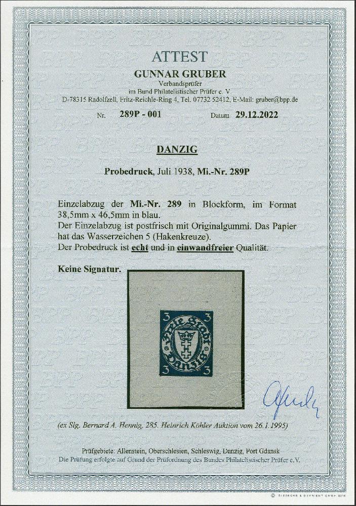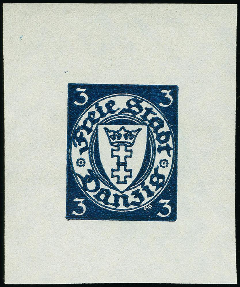 | Zusatzinformationen und Suchstichworte: | 383. Auktion Heinrich Köhler 14.–15. & 18.–23. März 2024 Los 7662 Danzig 1924, Staatswappen 3 Pfennig als ungezähnter Probedruck in der Farbe Blau mit Wasserzeichen 5 (Hakenkreuze) als Einzelabzug im Blockformat, postfrisch Ausruf 100,00 EUR |