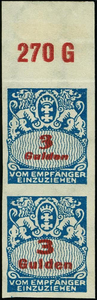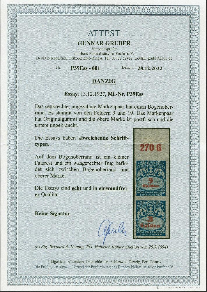 | Zusatzinformationen und Suchstichworte: | 383. Auktion Heinrich Köhler 14.–15. & 18.–23. März 2024 Los 7685 Danzig 1927, 3 Gulden Essay ungezähnt im senkrechten Oberrandpaar mit zwei verschiedenen Schrifttypen, die obere Marke ist postfrisch, im Oberrand und unten mit Falzrest sowie waagerecht oben vorgefaltet, sonst in guter Gesamterhaltung Ausruf 150,00 EUR |
