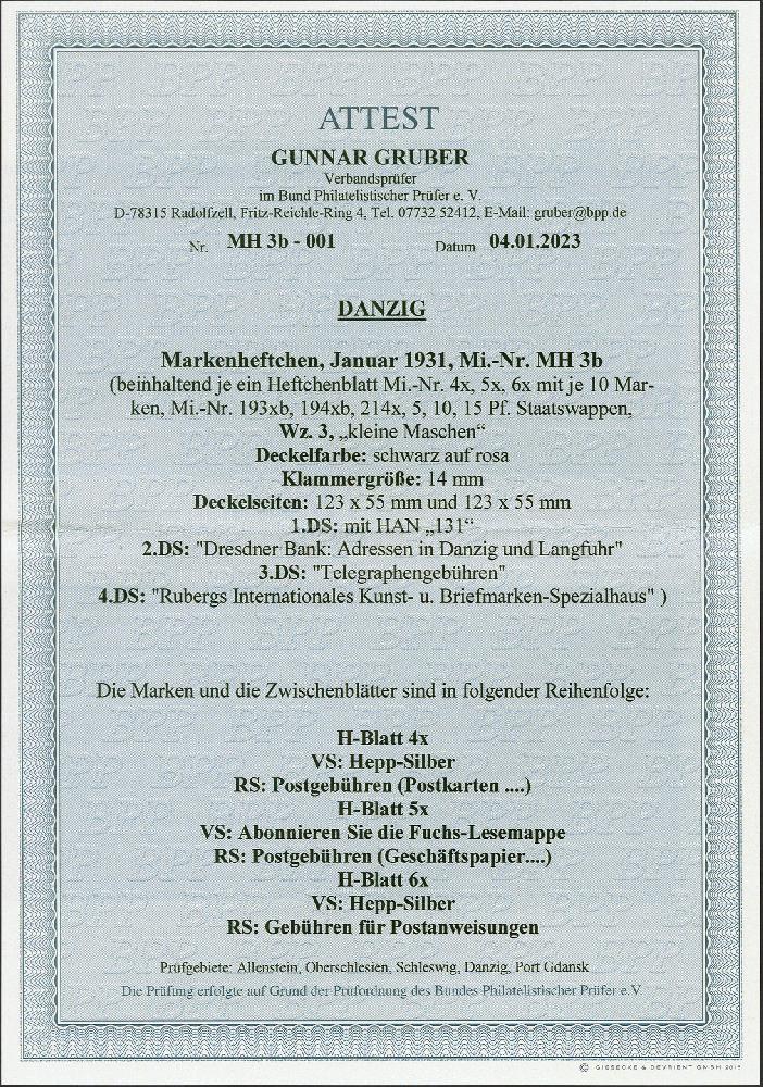| Zusatzinformationen und Suchstichworte: | 383. Auktion Heinrich Köhler 14.–15. & 18.–23. März 2024 Los 7691 Danzig 1931, Markenheftchen 3 Gulden mit HAN "131" und Deckel in Schwarz auf rosa, komplett, die postfrischen Heftchenblätter sind gut gezähnt und die Deckelvorderseite hat rechts neben der Klammer ein senkrechte Faltung und weitere kleine Büge, ansonsten in guter Gesamterhaltung, selten Ausruf 1.000,00 EUR |