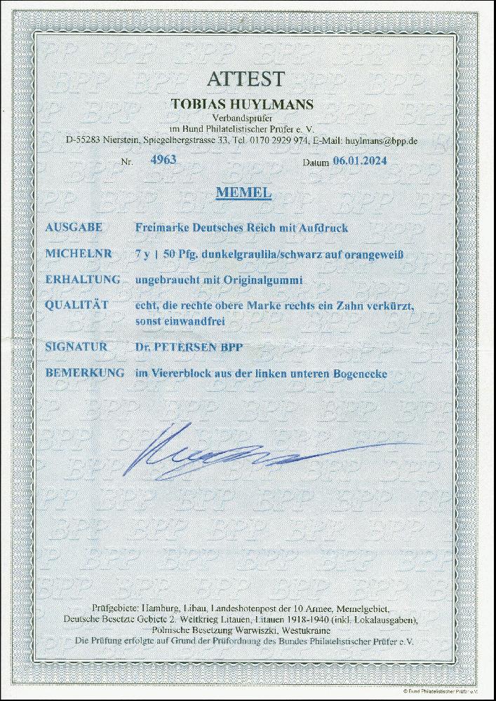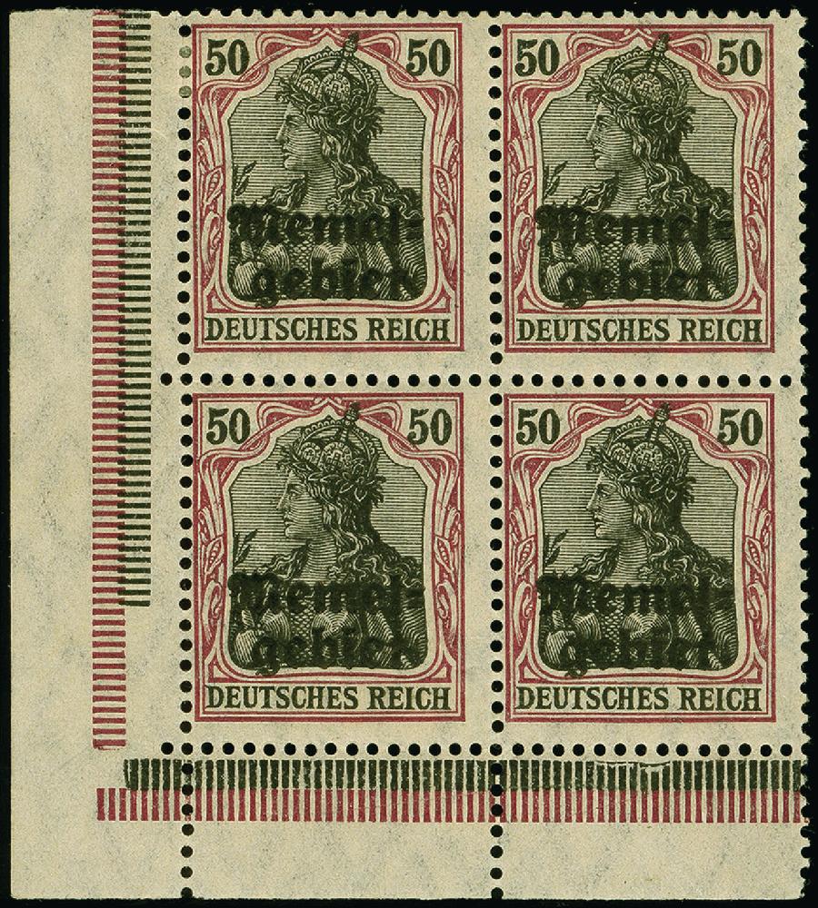 | Zusatzinformationen und Suchstichworte: | 383. Auktion Heinrich Köhler 14.–15. & 18.–23. März 2024 Los 2914 Memel 1920, Germania 50 Pfg. auf orangeweiß, Viererblock aus der linken unteren Bogenecke, sauber ungebraucht, tadellos Ausruf 120,00 EUR |