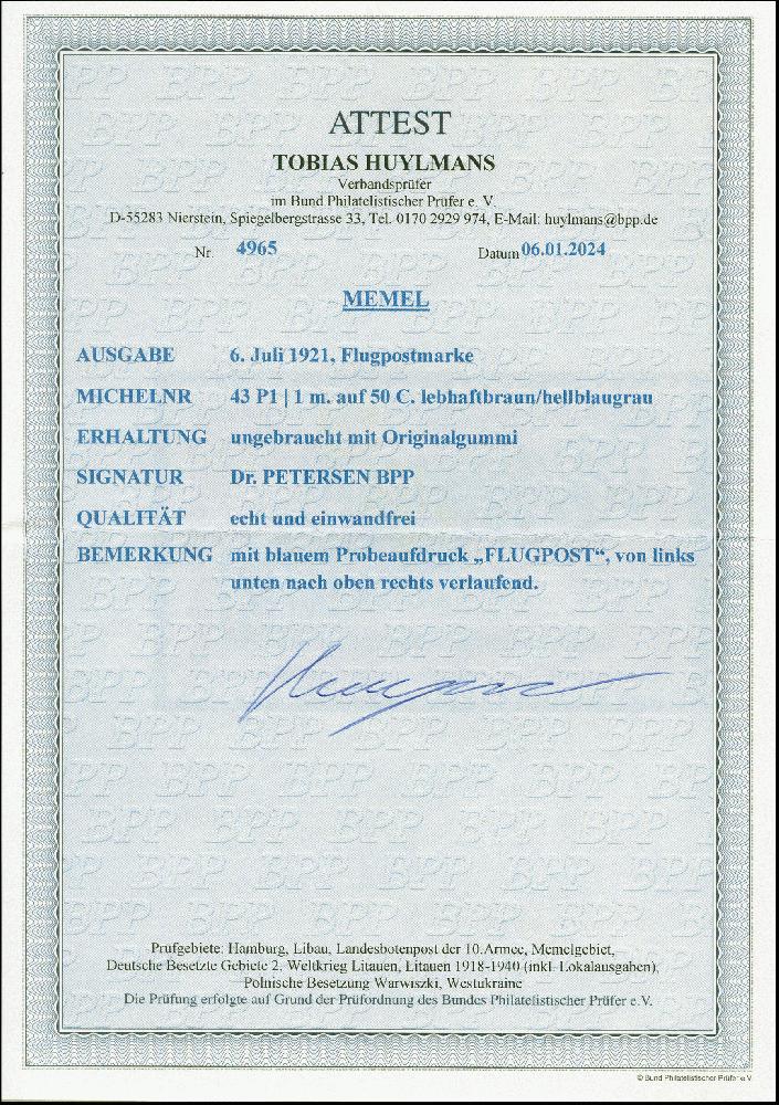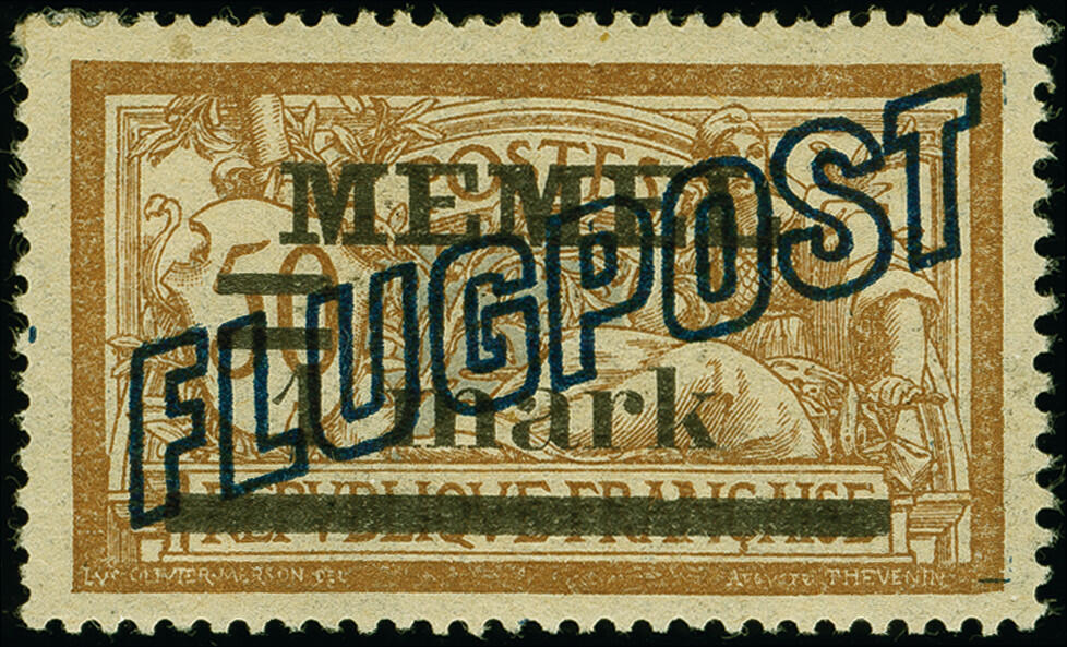 | Zusatzinformationen und Suchstichworte: | 383. Auktion Heinrich Köhler 14.–15. & 18.–23. März 2024 Los 2916 Memel 1921, Flugpost 1m. mit blauem Probeaufdruck "FLUGPOST" von links unten nach rechts oben verlaufend, sauber ungebraucht, tadellos Ausruf 200,00 EUR |