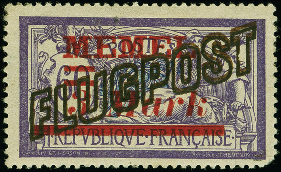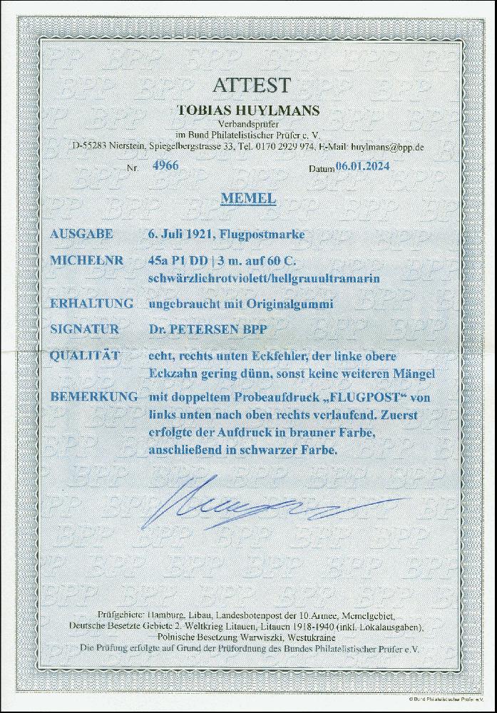 | Zusatzinformationen und Suchstichworte: | 383. Auktion Heinrich Köhler 14.–15. & 18.–23. März 2024 Los 2917 Memel 1921, Flugpost 3m. schwärzlichrotviolett mit doppeltem Probeaufdruck "FLUGPOST", zuerst in brauner, dann in schwarzer Farbe, von links unten nach rechts oben verlaufend, sauber ungebraucht, kleiner Eckfehler unten rechts bzw. dünner Eckzahn oben links, sonst tadellos Ausruf 200,00 EUR |