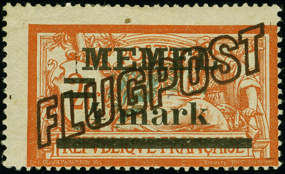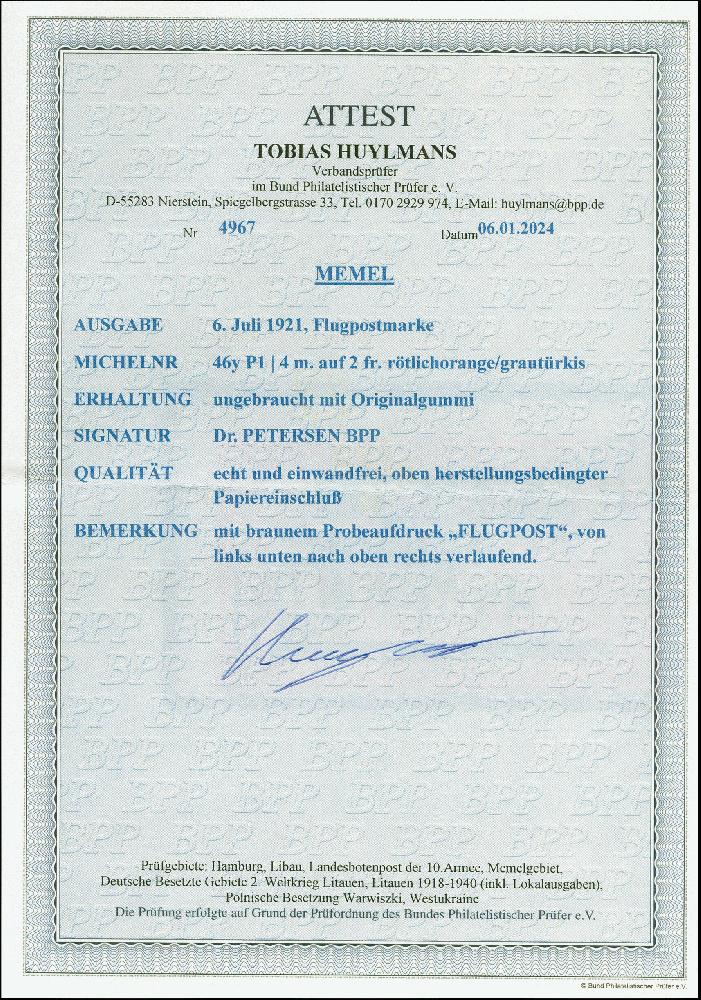 | Zusatzinformationen und Suchstichworte: | 383. Auktion Heinrich Köhler 14.–15. & 18.–23. März 2024 Los 2919 Memel 1921, Flugpost 4m. mit braunem Probeaufdruck "FLUGPOST" von links unten nach rechts oben verlaufend, sauber ungebraucht, tadellos Ausruf 200,00 EUR |