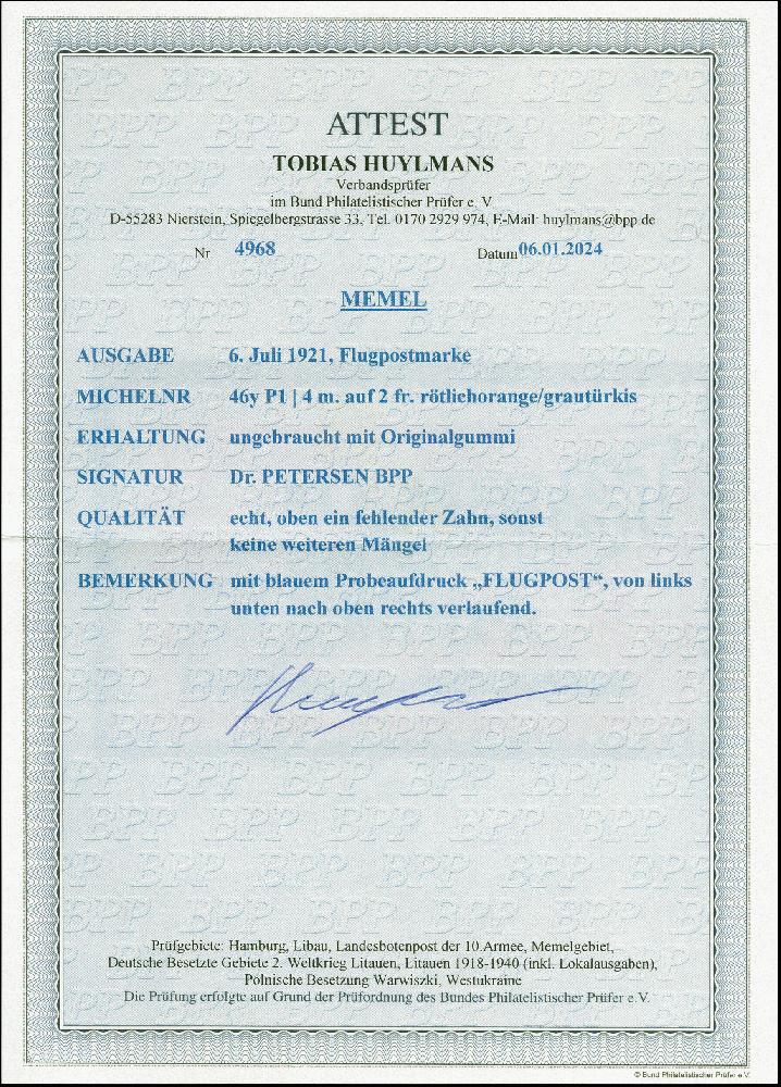 | Prüfer: | Huylmans, Tobias (BPP (Bund Philatelistischer Prüfer)) |