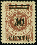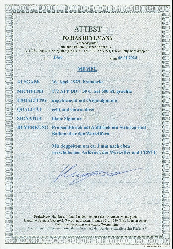 | Zusatzinformationen und Suchstichworte: | 383. Auktion Heinrich Köhler 14.–15. & 18.–23. März 2024 Los 2922 Memel 1923, 30 C. auf 500 M., doppelter Probeaufdruck mit Strichen statt Balken über den Wertziffern, sauber ungebraucht, tadellos Ausruf 80,00 EUR |