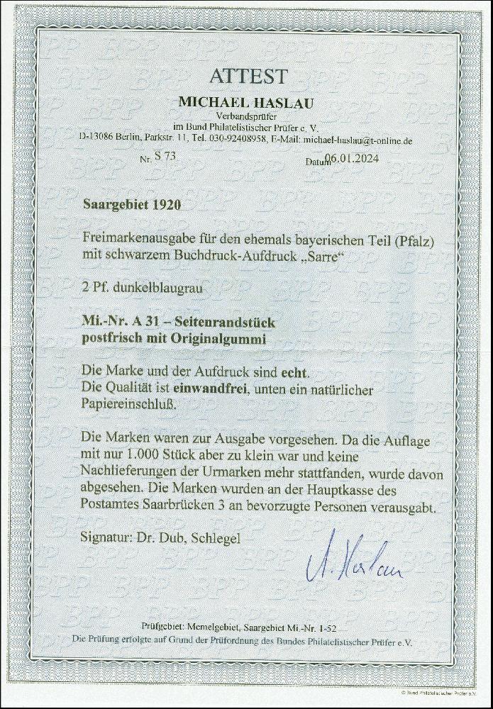 | Prüfer: | Haslau, Michael (BPP (Bund Philatelistischer Prüfer)) |