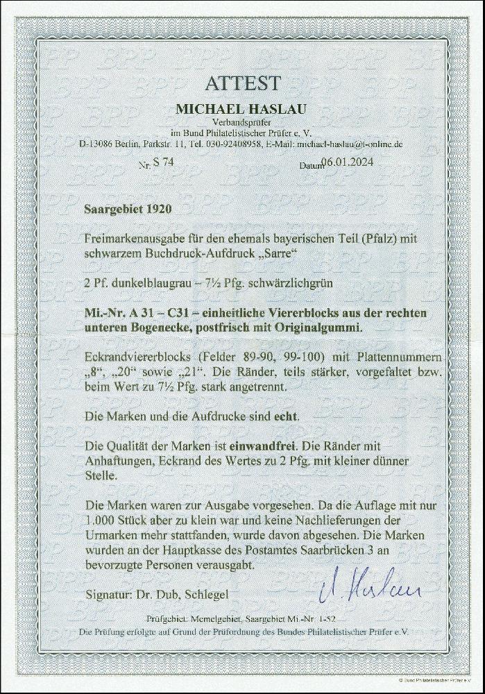 | Prüfer: | Haslau, Michael (BPP (Bund Philatelistischer Prüfer)) |