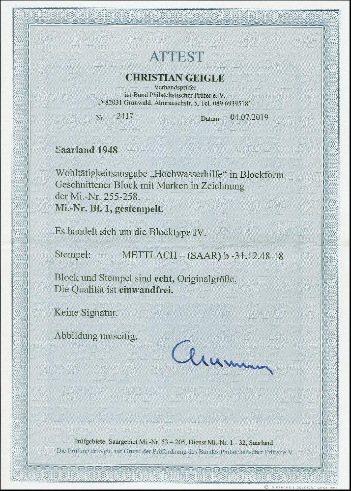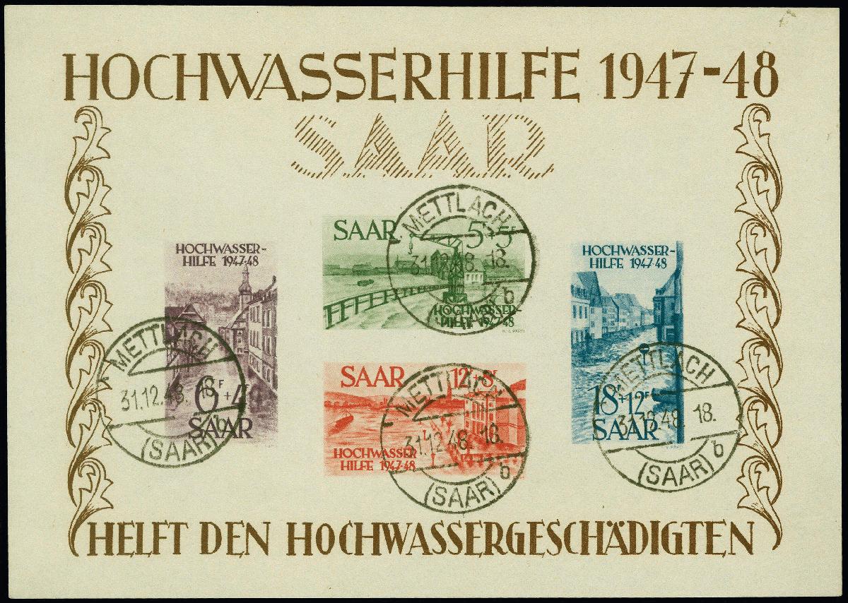 | Zusatzinformationen und Suchstichworte: | 383. Auktion Heinrich Köhler 14.–15. & 18.–23. März 2024 Los 3480 Saarland 1948, Hochwasser-Block 5-18 Fr. mit Stempel "METTLACH (SAAR) b 31.12.48" in einwandfreier Erhaltung Ausruf 500,00 EUR |