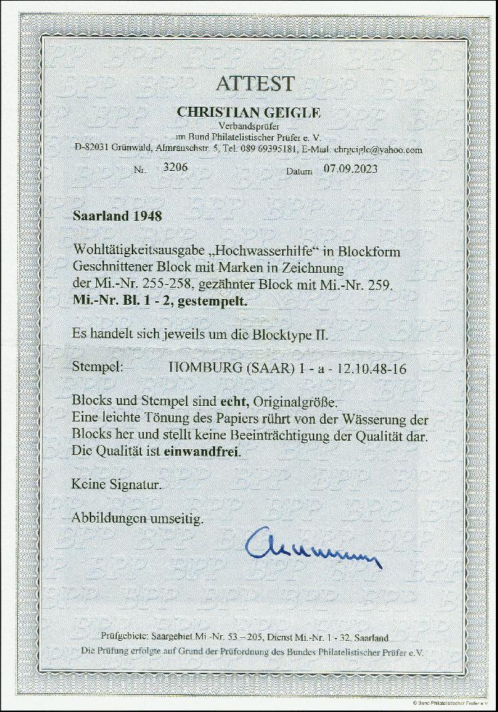 | Zusatzinformationen und Suchstichworte: | 383. Auktion Heinrich Köhler 14.–15. & 18.–23. März 2024 Los 3481 Saarland 1948, Hochwasser-Blockpaar, sauber gestempelt "HOMBURG 12.10.48", Papier von der Wässerung leicht getönt, tadellos Ausruf 1.000,00 EUR |