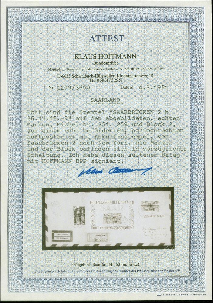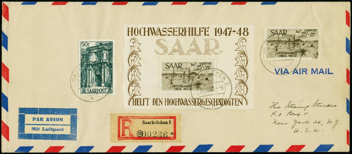 | Zusatzinformationen und Suchstichworte: | 383. Auktion Heinrich Köhler 14.–15. & 18.–23. März 2024 Los 5061 Saarland 1948, Hochwasser-Block 25Fr. mit Flugpostmarke 25 Fr. und weiterer Zufrankatur mit Stempel "SAARBRÜCKEN 2 26.11.48" auf langformatigem R-Brief nach New York mit Ankunftstempel, rechts im Umschlag winzig geknittert und kleiner Einriss, sonst tadellos, selten Ausruf 500,00 EUR |